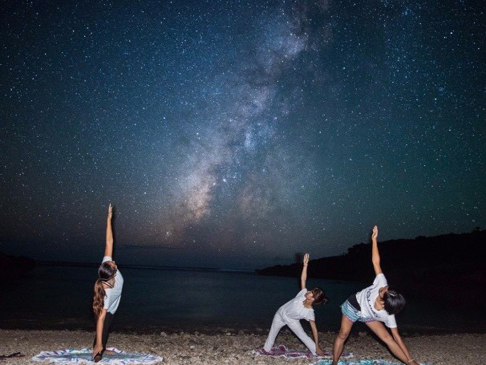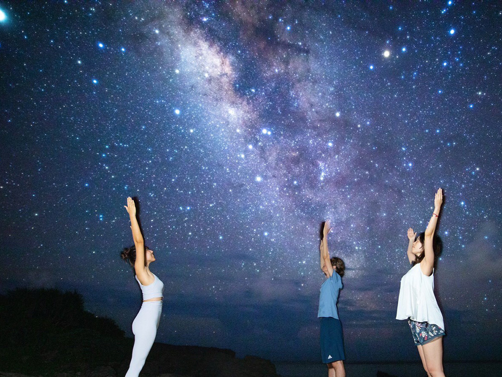 新月の時期には満点の星空や天の川を、満月の時期には空に浮かぶ満月を眺めながら行うナイトヨガ。